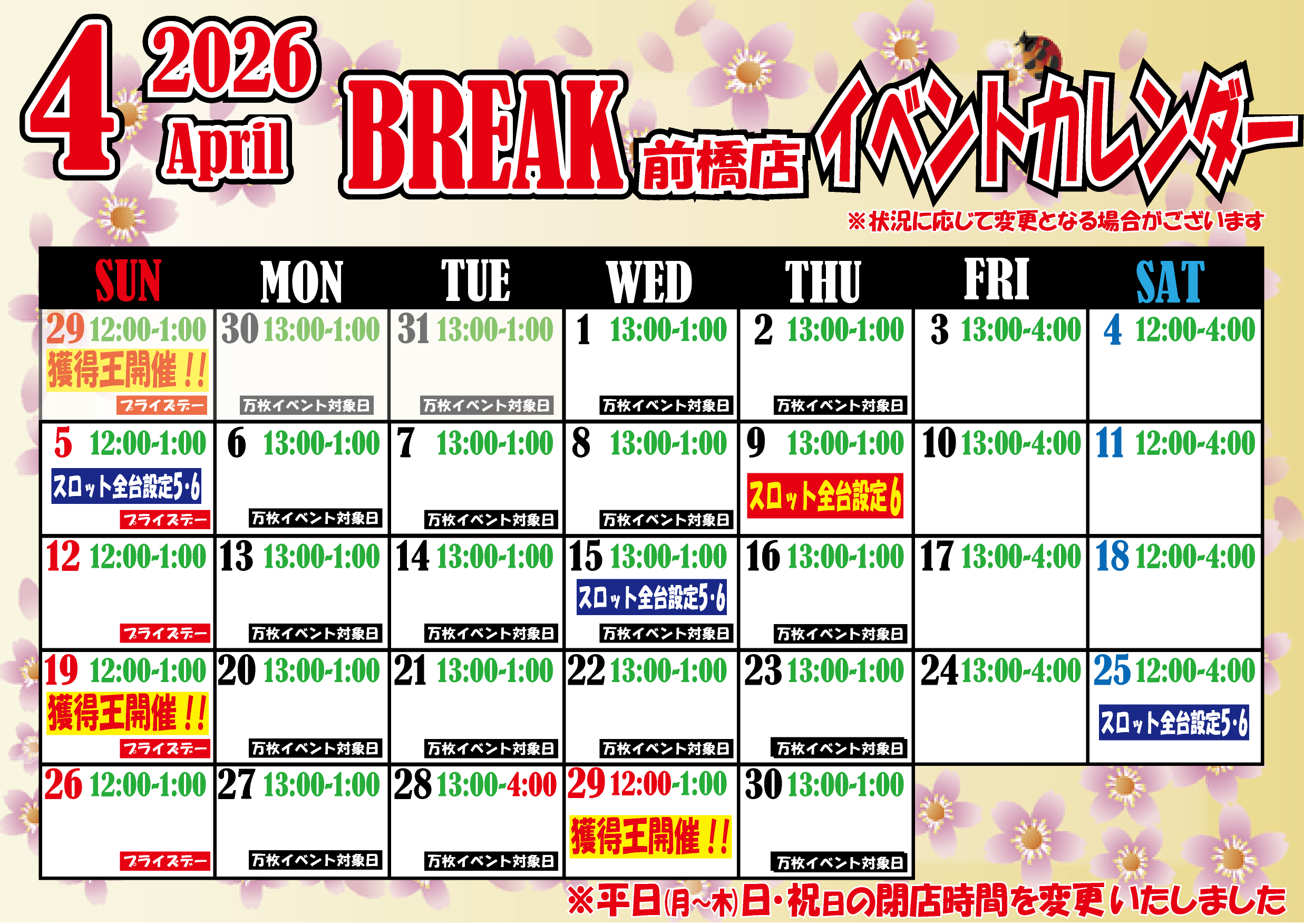 Point① 麻雀格闘倶楽部\100/2クレ設定! Point② ぶっちぎりイベント開催!!(内容は当日発表) ![]() 最新バージョン麻雀格闘倶楽部 UNION 好評稼働中!! ライフ増設定に加え全モードEASY設定!! 更に!!現在200円/3クレジット設定!!(BREAKの日は実施しておりません。) 設置台数は5台! 全台ワイド筐体です。この機会に是非プレイしてください。 (金・土・祝前日は朝4:00まで) BREAKでは、ビリヤードが遊び放題で1時間400円!
